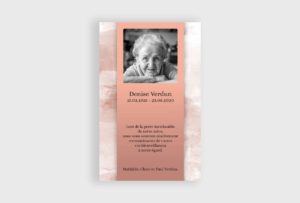 Fond aquarelle surmonté d’un bandeau au dégradé de couleur rose orangé. La photo du défunt au format carré y est mise en valeur.