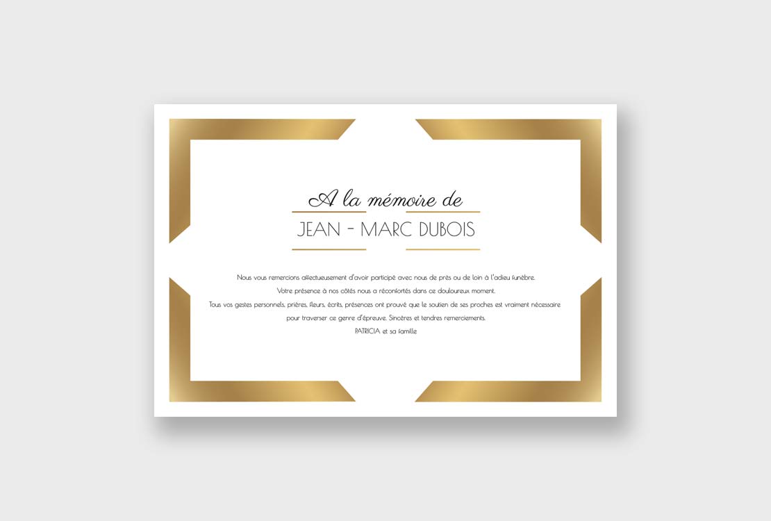 Cette carte de remerciement décès est lumineuse par son cadre or.
