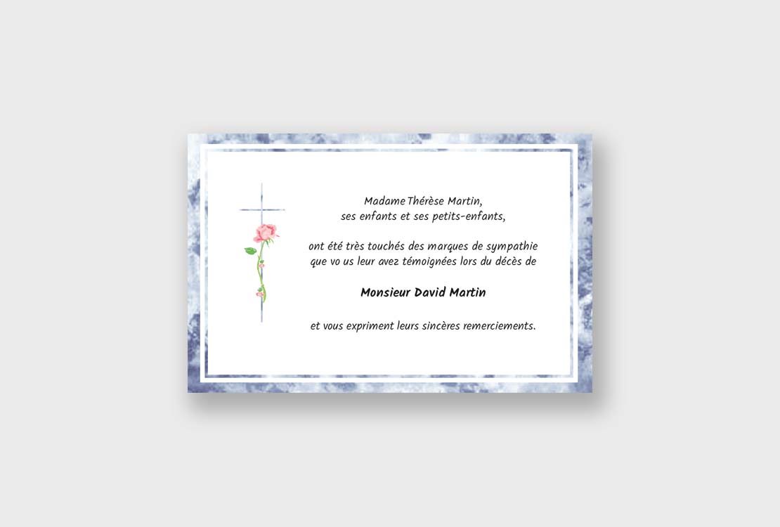 Cette carte de remerciements décès « Marbre » est illustrée d’une jolie rose sur une croix.