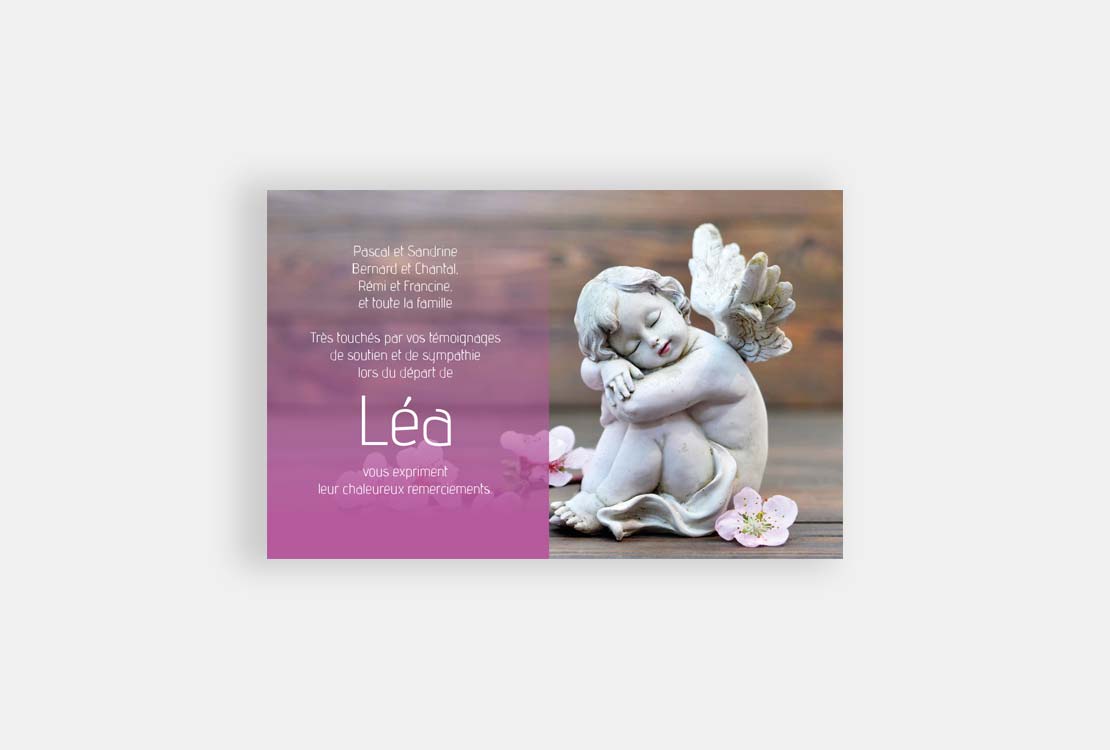 Cette carte de remerciement décès « Ange rose », invite au recueillement et à la prière.