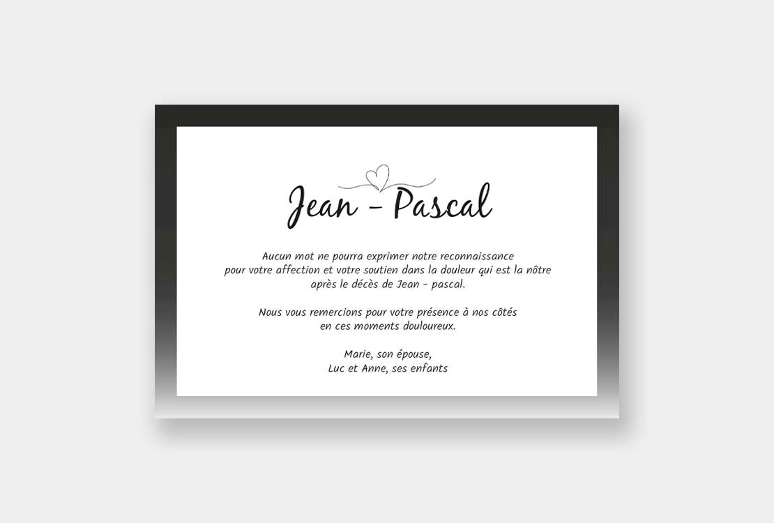 Cette carte de remerciement décès est encadrée d’un dégradé noir et blanc.