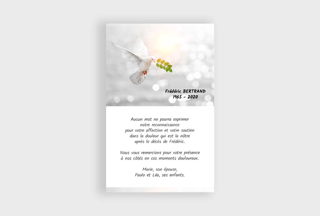Cette jolie colombe avec son rameau d’olivier dans le bec est symbole de paix… Le fond mer apporte douceur et spiritualité à cette élégante carte de remerciement décès.