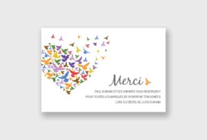 Cette carte de remerciements décès est illustrée d’un joli envol d’oiseaux en forme de coeur.