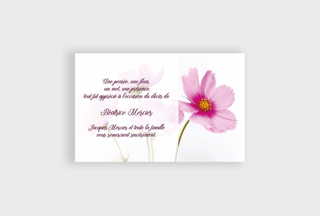 Jolies fleurs sauvages pour cette carte de remerciements décès, aux tons rosés et blanc.