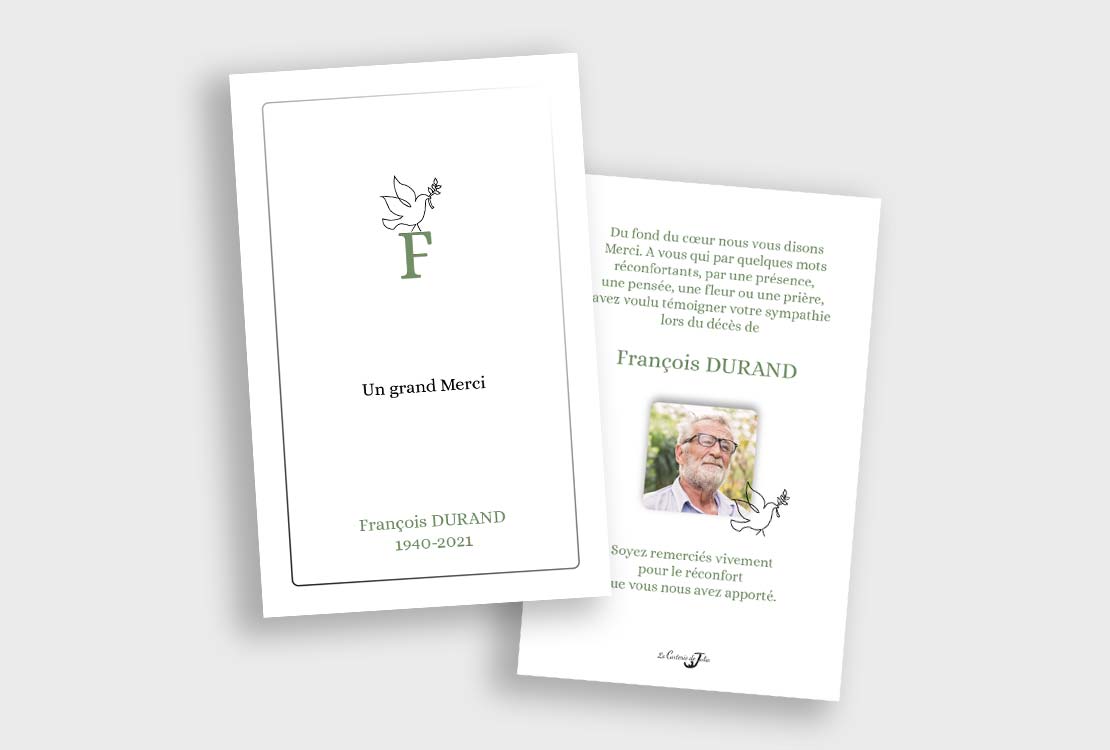 La carte de remerciements décès « Lettrine » est moderne. Au verso, vous pourrez insérer une petite photo du défunt dans un cadre carré accompagné d’une colombe.