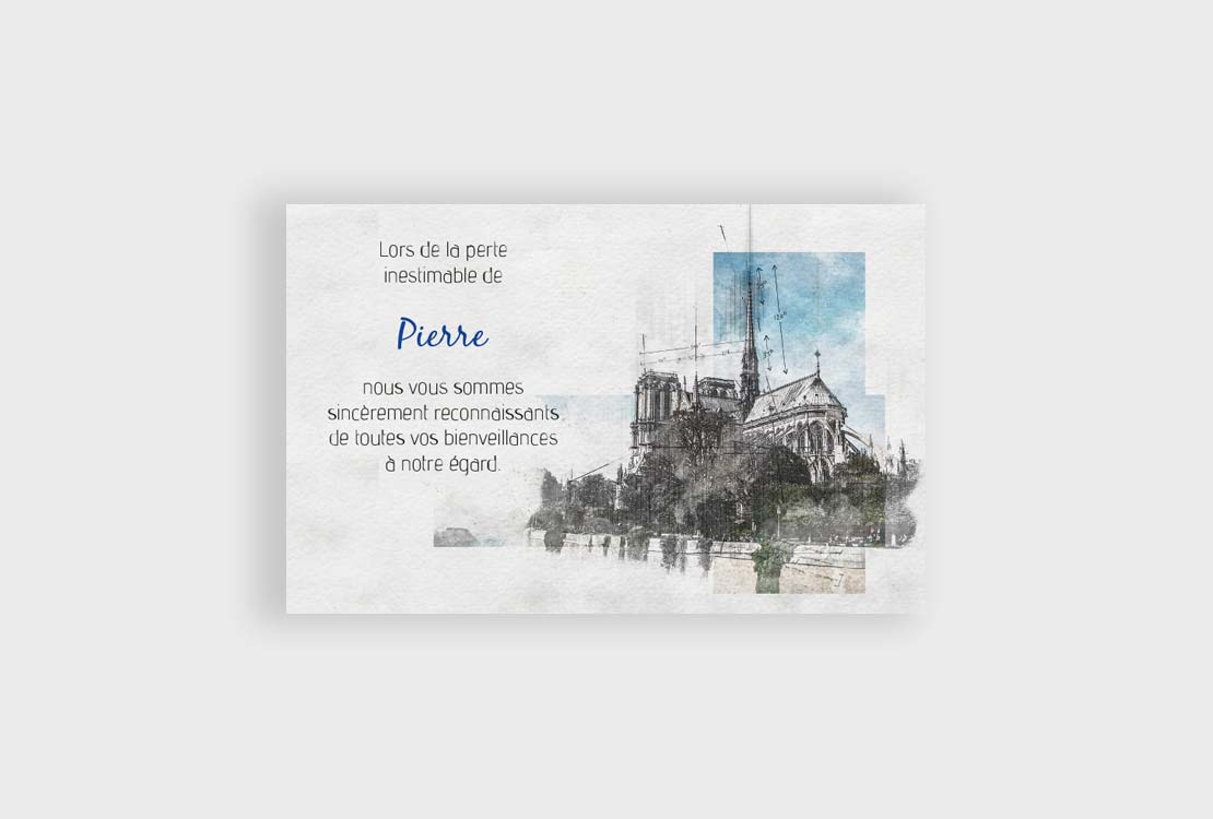 Cette carte de remerciement décès, est joliment illustrée avec une aquarelle de la cathédrale Notre Dame de Paris.