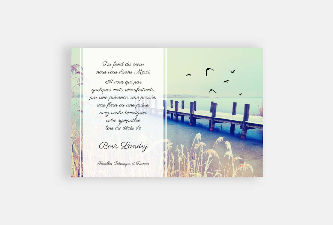 Jolie carte présentant un ponton et des roseaux sous le givre. Les oiseaux symbolisant le départ de l’être aimé…